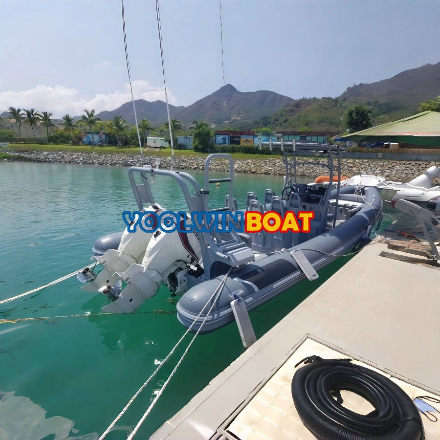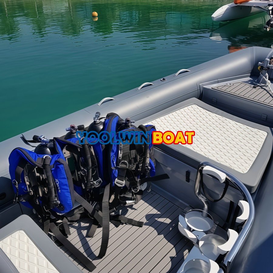 860 diving aluminum rib boat ideal choice for personal diving or scuba dive charters. Deep V aluminum hull structure design ensure the boat with smooth ride on different water conditions. Can be used offshore boat or lake/ river use boat. Front deck with large space, equip with oxygen tank holders, max for 10 units oxygen tanks. Back equip with diving platform and ladder. Durable, corrosion-resistant, and CE certified—it maximizes charter efficiency with reliable performance.
